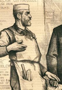 Whipped up by the Tammany frenzy is New York’s version of the Workingmen’s Party. Led by Nast’s quintessential brawny Irish leader, the mob angrily turn the corner toward Columbia and the Chinese target. Nast dresses his thugs as would-be gentlemen. His Irish brute wears a waistcoat and top hat. The high fashion does not change his savage character or propensity for violence.