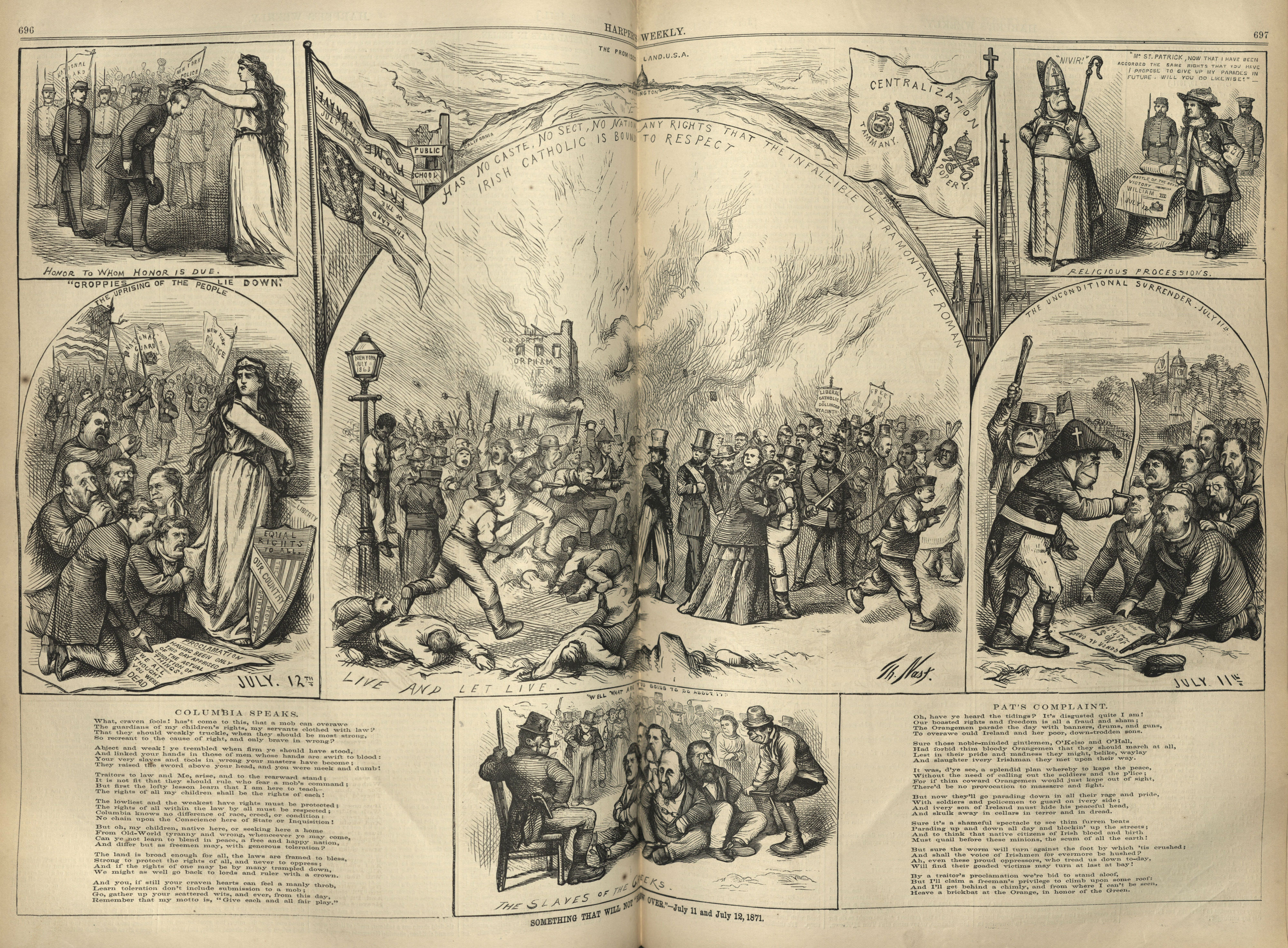 Thomas Nast drew Something That Will Not Blow Over, a double-paged illustration in Harper’s Weekly, in direct response to the Orangemen’s Riots of July 1871. The incident marked the second year in a row where violence resulted from a St. Patrick’s Day parade in New York City. Nast’s piece features a large central drawing, with various smaller vignettes surrounding the main picture.