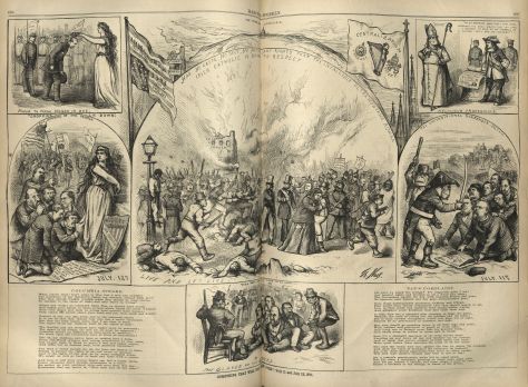 Nast’s 1871 revision hardly resembled his original eyewitness account of 1863, where he is ambiguous about Irish involvement on Clarkson Street, a scene of racial lynching in 1863. By linking the Orangemen’s riots to the eight-year-old draft riots, Nast loses the ambiguity of Irish and Catholic involvement in the public violence. In the eight years that elapsed, Nast’s views against Irish Catholics changed and intensified.