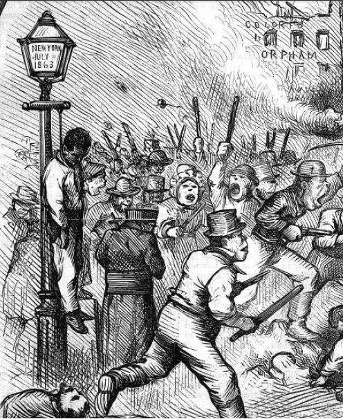Detail.Nast resurrects imagery from the 1863 New York City Draft Riots to condemn the Irish involvement in the Orangemens’ Riot of 1871.
