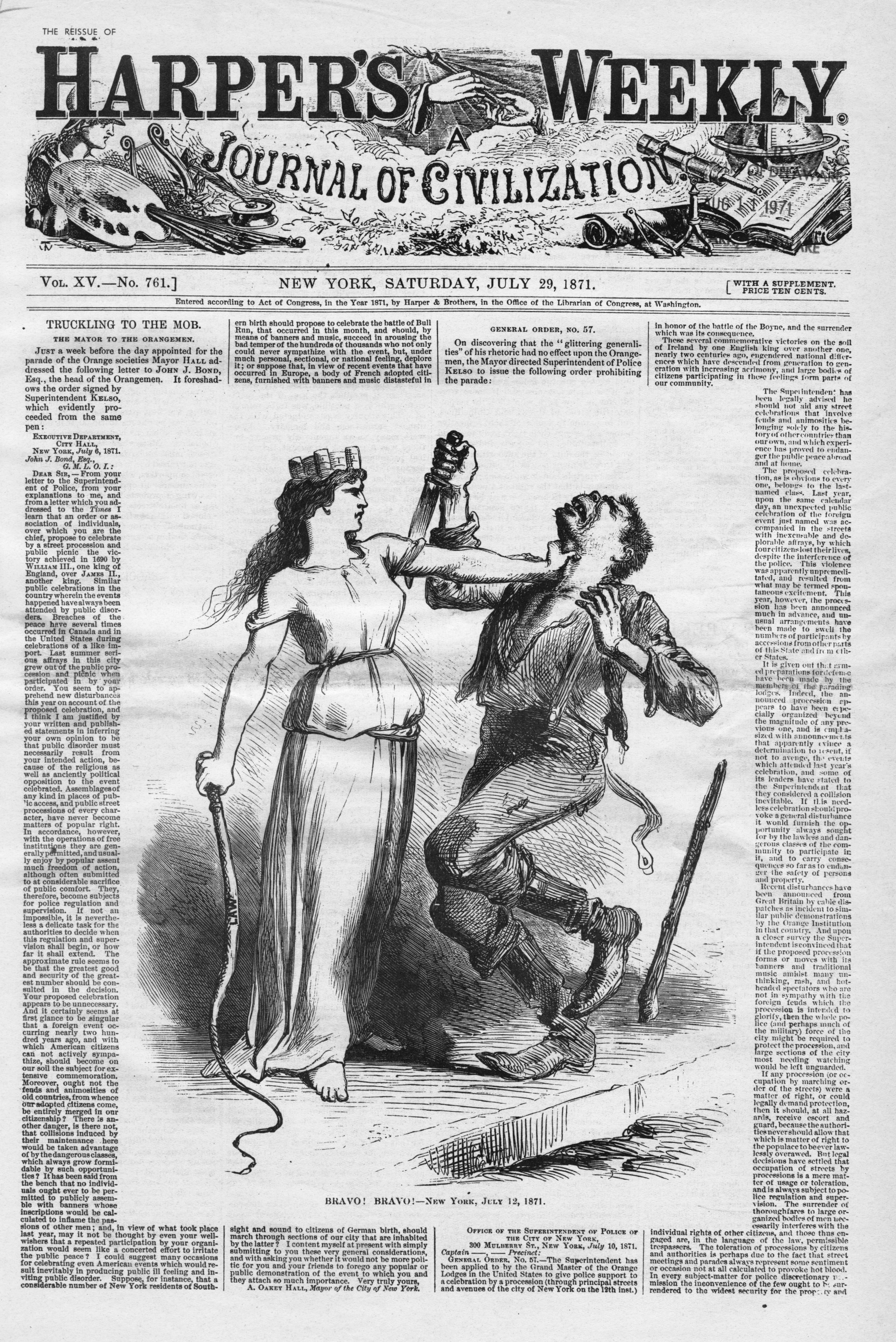 Bravo Bravo, Harper’s Weekly cover image for its issue on the Orangemen’s Riots. The issue devoted considerable space to coverage surrounding the riots. New York Governor Hoffman reversed an order that denied Protestant Irish a permit to parade and celebrate a holiday. In doing so, Hoffman displayed uncharacteristic strength by countering Tweed’s lobbying efforts to prevent a Protestant parade — an event that would distress his Irish-Catholic constituents. Permit allowed — denied— and allowed again percolated emotions and created an environment and venue upon which the Irish felt compelled to express their outrage with threats of violence.