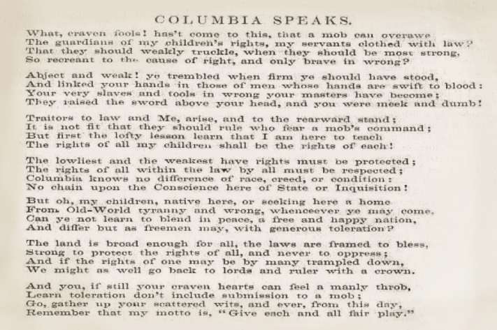Columbia Speaks March 3, 2015 711 × 473 “Something That Will Not Blow Over” – 29 July, 1871 Share this: Share on X (Opens in new window) X Share on Facebook (Opens in new window) Facebook Email a link to a friend (Opens in new window) Email Print (Opens in new window) Print Share on Tumblr (Opens in new window) Tumblr Share on Reddit (Opens in new window) Reddit More Share on Pinterest (Opens in new window) Pinterest Share on LinkedIn (Opens in new window) LinkedIn Like Loading...
