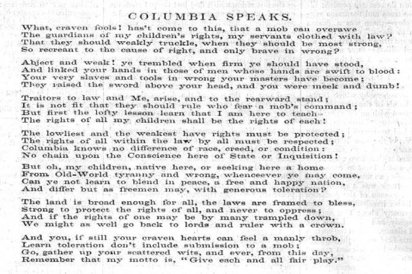 Columbia Speaks June 2, 2012 877 × 583 “Something That Will Not Blow Over” – 29 July, 1871 Columbia Speaks regarding Orangemen’s Riots of 1871 Share this: Share on X (Opens in new window) X Share on Facebook (Opens in new window) Facebook Email a link to a friend (Opens in new window) Email Print (Opens in new window) Print Share on Tumblr (Opens in new window) Tumblr Share on Reddit (Opens in new window) Reddit More Share on Pinterest (Opens in new window) Pinterest Share on LinkedIn (Opens in new window) LinkedIn Like Loading...