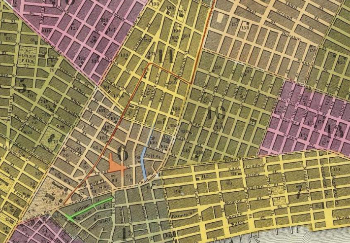 Nast childhood home: Bottom center left, I have highlighted in green, Nast’s childhood home. The family originally resided on the lower west side on Greenwich Street, but soon moved to William Street near Frankfort Street, in the Fourth Ward of Manhattan. Five Points, in the Sixth Ward, is located just north and slightly east.