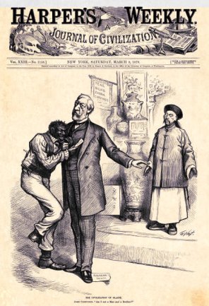 The Burlingame Treaty appears in many Nast cartoons as a prop, usually desecrated by James G. Blaine, a Republican politician who broke with his party’s more liberal positions and regarded the Chinese in America as little better than indentured slaves. With a view of the Chinese as coolie laborers, Blaine put little stock in the validity of the Burlingame Treaty and was an outspoken critic against the Chinese in general (HarpWeek.com).