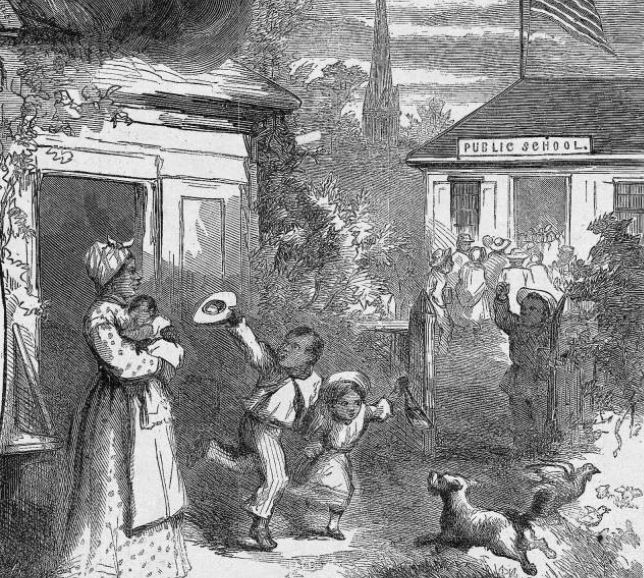 Detail of Emancipation (1863) showing African Americans happily attending a public school. Nast was a hundred years ahead of his time.