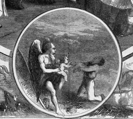 Detail of lower circle. This smaller circle image was changed to a Lincoln portrait in 1865, after Lincoln’s assassination, when the cartoon was reprinted and issued as commemorative to honor one of Lincoln’s greatest legacies