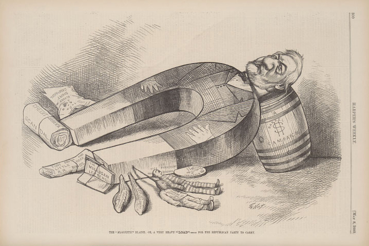 On the eve of the 1880 Republican convention, Nast introduced one of his favorite targets, James G. Blaine, as a”magnetic man “who had attracted many undesirable political features” (Paine 425).